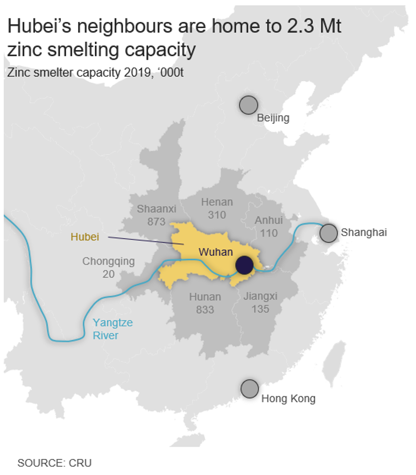 There are no zinc mines or smelters in Hubei, the epicenter of the outbreak, and of the neighboring provinces Hunan is the only significant miner, but smelters are beginning to feel the effects of weak demand.