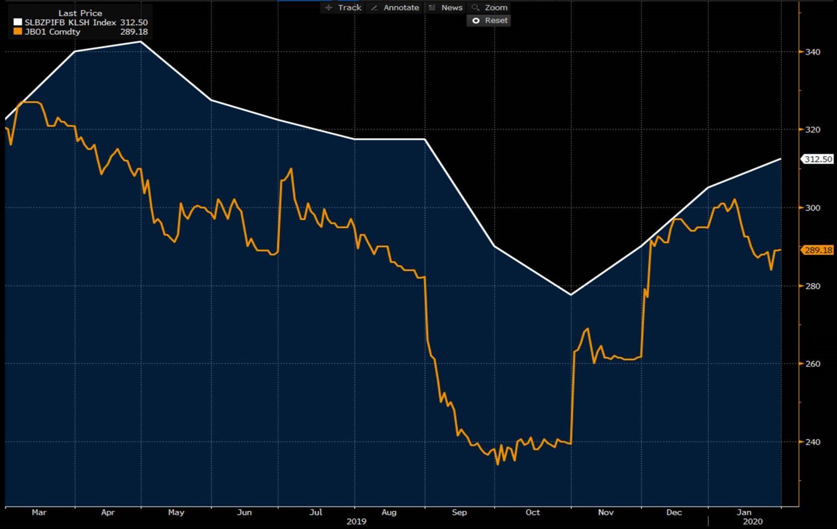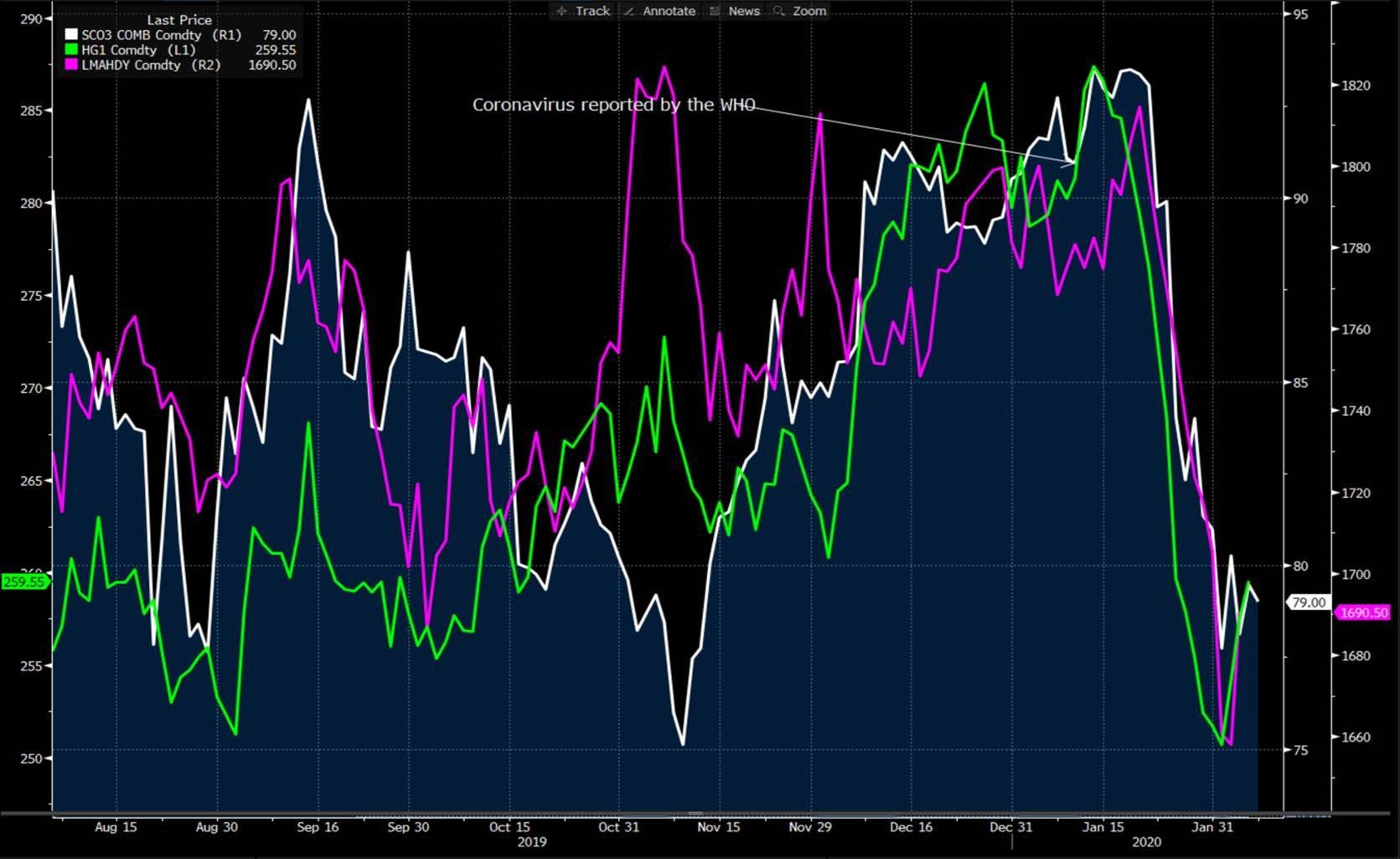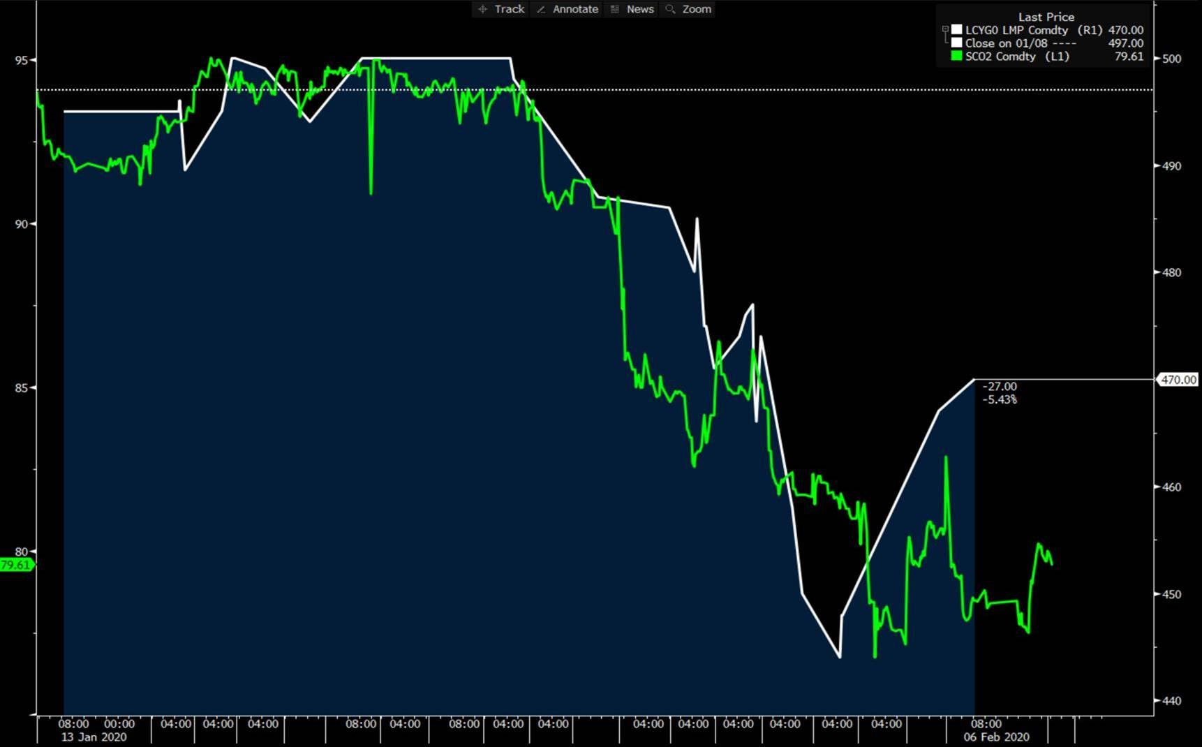 Shifting over to China briefly – another divergence is appearing – between steel and ore. You can see by the below chart that the Feb HRC steel contract (white) is starting to rally after selling off in tandem with iron ore (green). This makes some sense because if steel production is disrupted we should see higher prices there, while ore may be in lower demand until the implications are more clear.