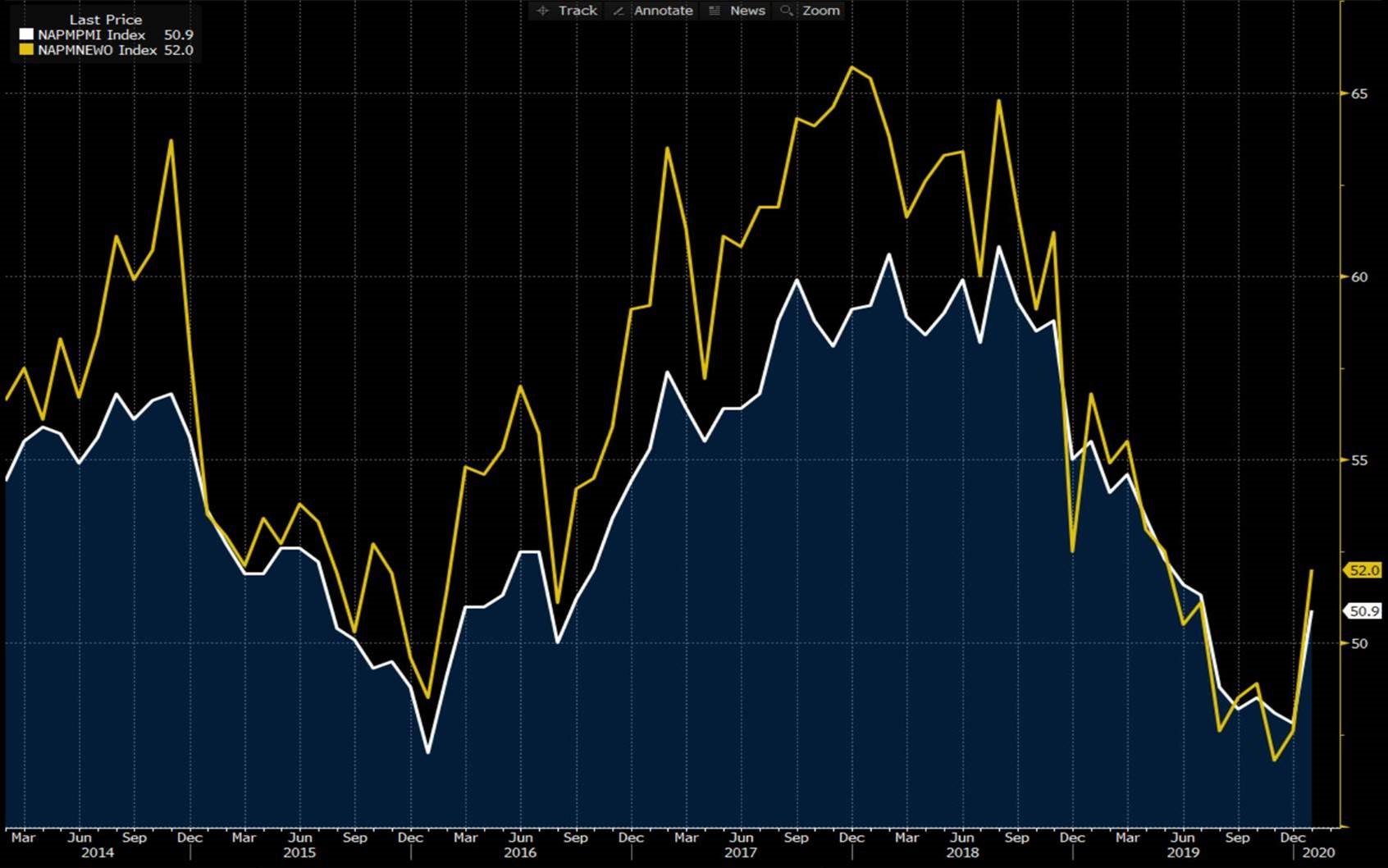 Back in the U.S., the ISM Purchasing Managers Index did spike back above 50 (white), and the important New Orders component (yellow) also ramped up in January, which was a welcome change from the readings in late 2019, which were stuck below 50.