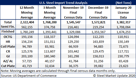 However, on a preliminary basis, finished steel imports in January show a nearly 24 percent increase when comparing January licenses totaling 1.67 million tons to the final December imports of 1.35 million tons. Note that when the final Census data for January is published in the coming weeks, finished steel imports are likely to be more modest, based on the three-month moving average of 1.4 million tons.