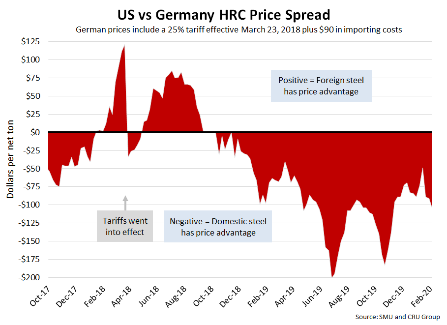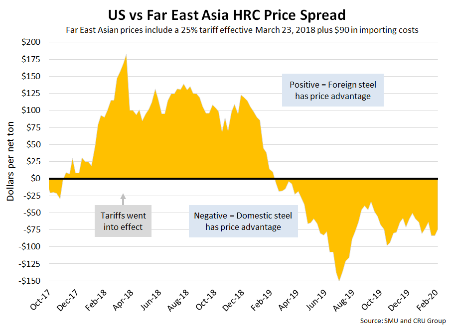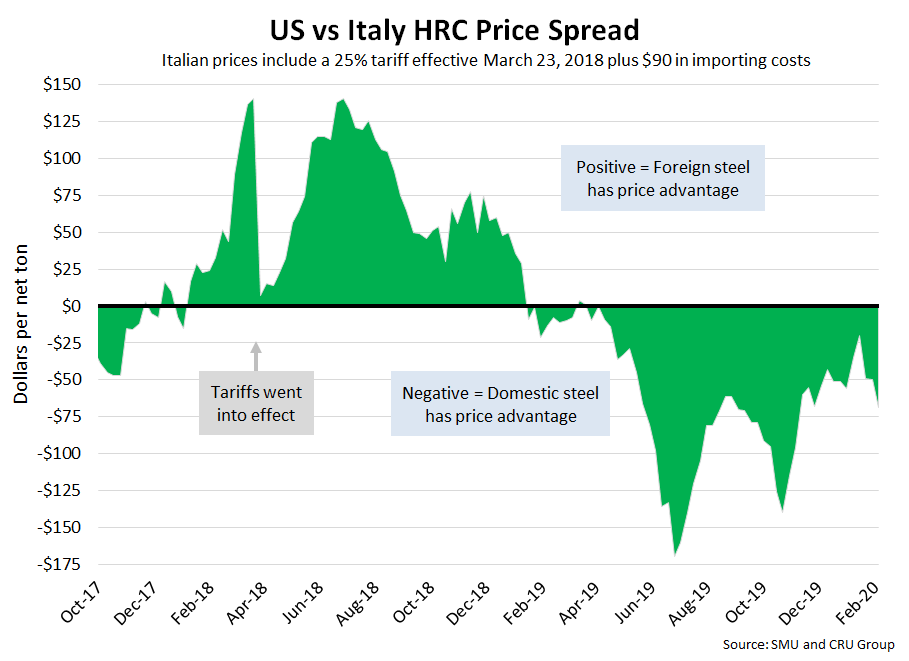 SMU includes a 25 percent import tariff effective on foreign prices after March 23, 2018. We then add $90 per ton to the foreign prices in consideration of freight costs, handling, trader margin, etc., to provide an approximate “CIF U.S. ports price” that can be compared against the SMU U.S. hot rolled price. Note that we do not include any antidumping (AD) or countervailing duties (CVD) in this analysis.