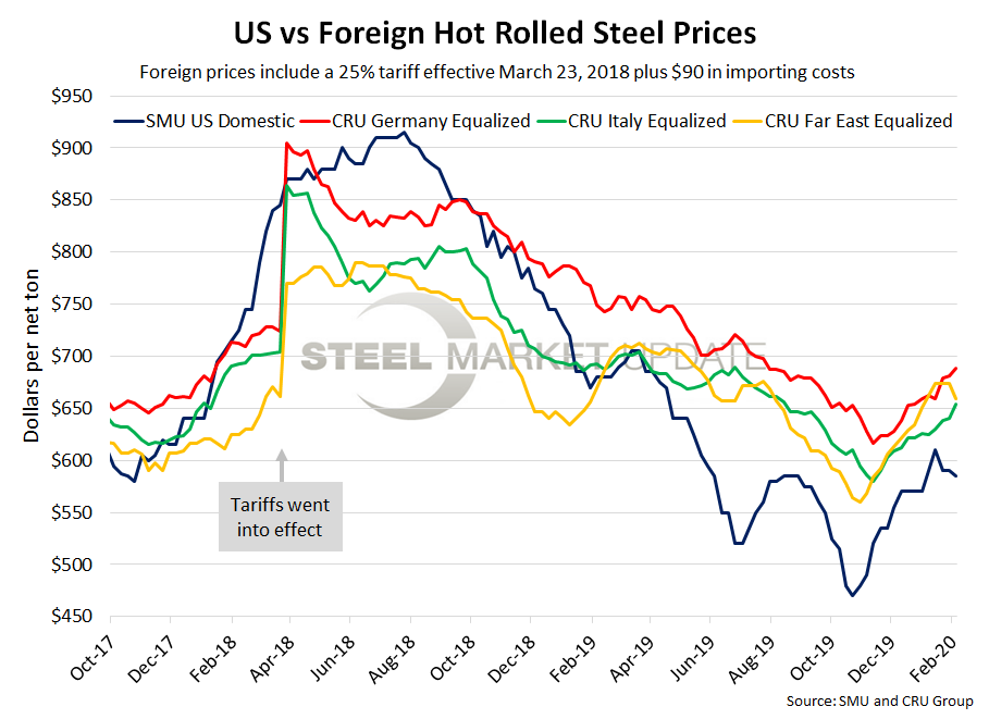As of Wednesday, Feb. 5, the CRU German HRC price was $479 per net ton, up $6 over the previous week and up $8 from two weeks prior. Adding tariffs and import costs, that puts the German price at $689 per ton delivered to the U.S. The latest SMU hot rolled price average is $585 per ton, down $5 over both last week and two weeks prior. Therefore, domestically sourced HRC is theoretically $104 per ton cheaper than imported German HRC; the spread was $91 last week and $89 two weeks ago. U.S. prices have held this price advantage for 64 consecutive weeks.