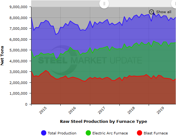 The chart below shows total monthly steel production (blue) broken down by electric arc furnace production (green) and blast furnace production (red).