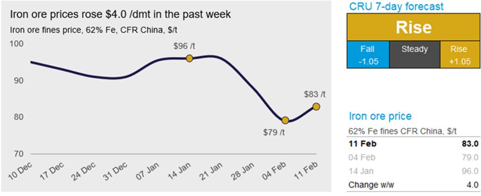 Iron ore prices bounced back in the past week with Tropical Cyclone Damien forcing Port Hedland and Rio Tinto’s two ports to shut for three to six days. This resulted in ~10 Mt of shipments taken out of the seaborne market. At the same time, the sentiment in the futures markets improved on Tuesday and iron ore is currently trading at $83 /t, a $4.0 increase w/w.