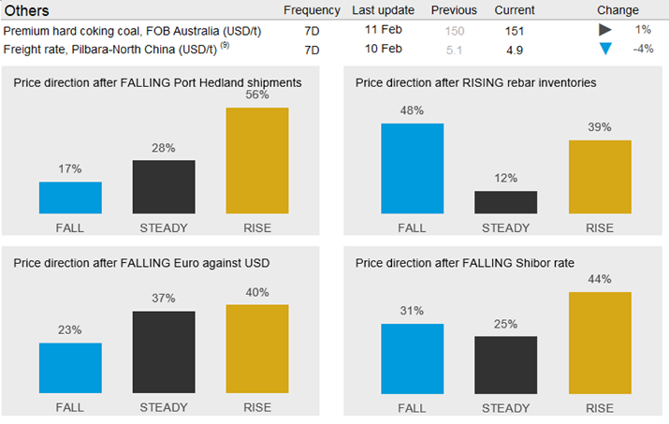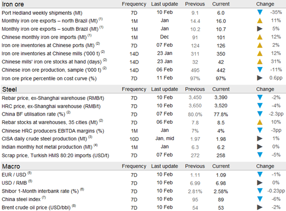 In the past week, seaborne iron ore supply was at its weakest level since March 2019 when Cyclone Veronica swept in across the Pilbara region. Cyclone Damien has resulted in Rio Tinto’s two ports closing for several days and we are expecting no shipments for a period of nearly one week. Port Hedland is located further east and the impact on the port was less severe as no exports took place between Feb. 8-10. In addition, the heavy rain over the mining areas is expected to restrict production in the coming week.