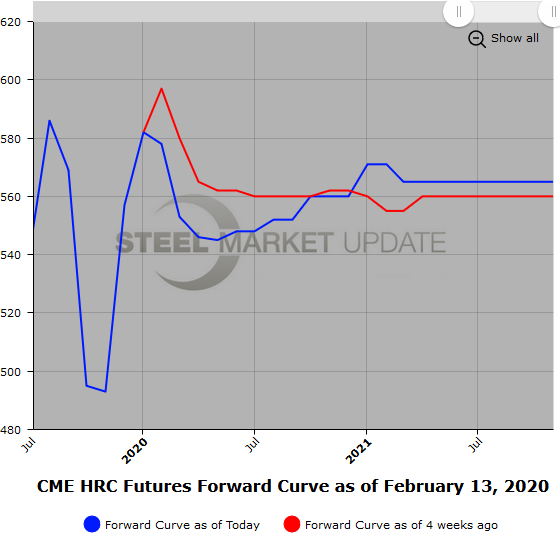 Below is a graph showing the history of the CME Group hot rolled futures forward curve. You will need to view the graph on our website to use its interactive features; you can do so by clicking here. If you need assistance with either logging in or navigating the website, please contact us at info@SteelMarketUpdate.com.