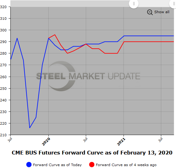 Below is another graph showing the history of the CME Group busheling scrap futures forward curve. You will need to view the graph on our website to use its interactive features; you can do so by clicking here.
