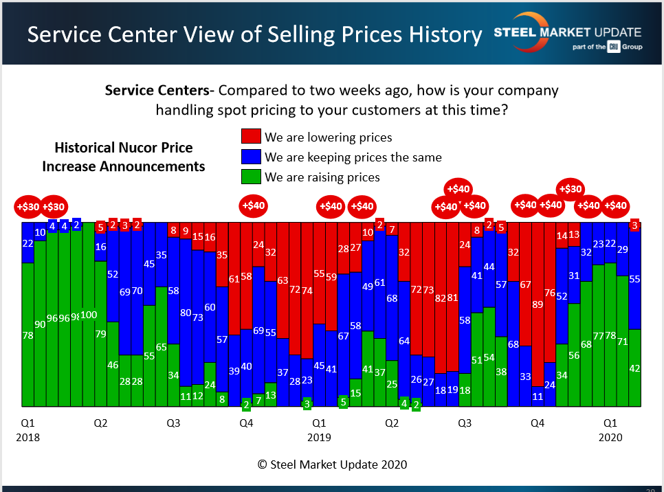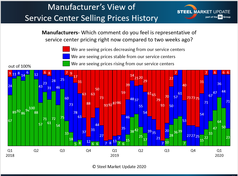 Just 42 percent of the service centers responding to SMU’s questionnaire last week said they are currently raising prices to their customers. That’s down from 71 percent two weeks prior and a peak of 78 percent in mid-January, as can be seen in the green bars in the chart below. A small percentage even indicated they are now lowering prices to secure orders. The last time the red bar appeared on the chart, and service centers were discounting, was back in November.