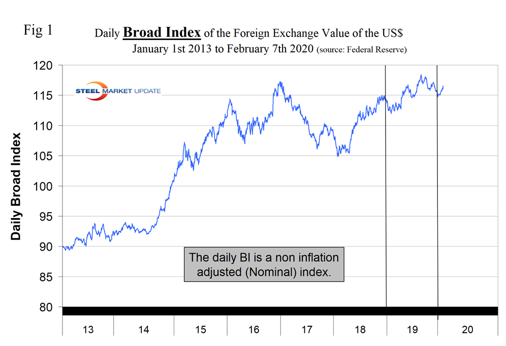 Explanation of Data Sources: The Broad Index is published by the Federal Reserve on both a daily and monthly basis. It is a weighted average of the foreign exchange values of the U.S. dollar against the currencies of a large group of major U.S. trading partners. The index weights, which change over time, are derived from U.S. export shares and from U.S. and foreign import shares. The data are noon buying rates in New York for cable transfers payable in the listed currencies. At SMU, we use the historical exchange rates published in the Oanda Forex trading platform to track the currency value of the U.S. dollar against that of 16 steel trading nations. Oanda operates within the guidelines of six major regulatory authorities around the world and provides access to over 70 currency pairs. Approximately $4 trillion U.S. dollars are traded every day on foreign exchange markets.