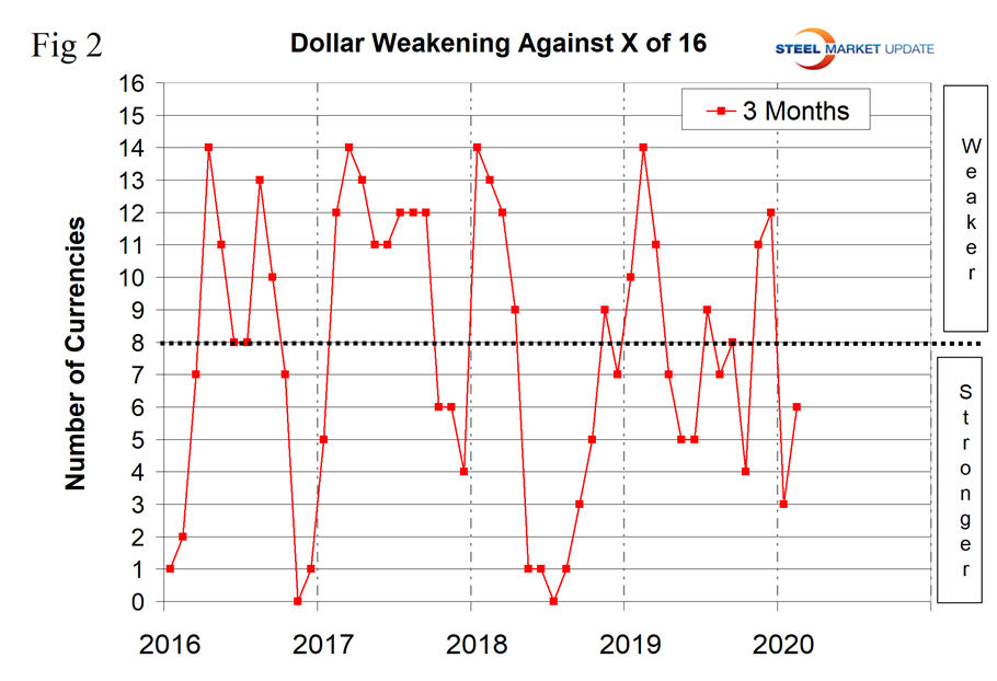 The currencies of these 16 don’t necessarily follow the Broad Index value of the U.S, dollar. In fact, at any given time, some are always moving in the opposite direction. The latest value of the Broad Index as published by the Federal Reserve was Feb. 7. In the three months prior to that date, the dollar had weakened by 0.5 percent; therefore, in this instance, the currencies of the steel trading nations are not coincident with the Broad Index