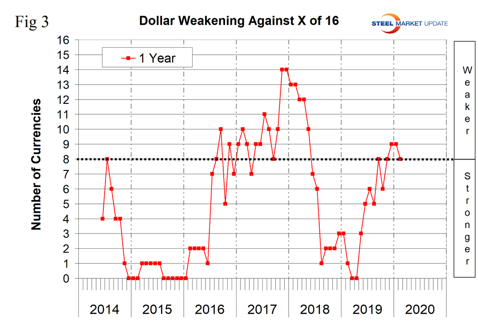 To try to get a less volatile look at the changes in value of the 16 currencies under examination here, we have developed Figure 3. This shows the number of currencies against which the dollar was weakening on a year-over-year basis. In March and April 2019, the dollar was strengthening against all 16, but by mid-February 2020 it was only strengthening against 8.