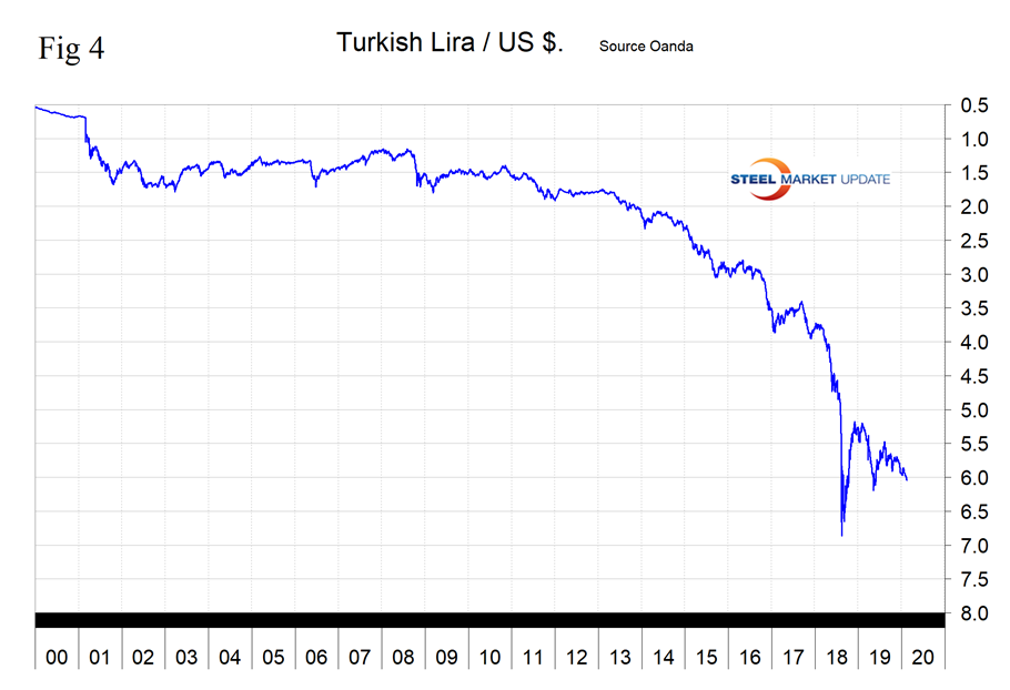 In the last 12 months, Turkey’s lira has declined by 12.7 percent, by 4.8 percent in three months and by 2.8 percent in the last 30 days. Since Jan. 1, 2019, the lira has declined by 14.6 percent (Figure 4).