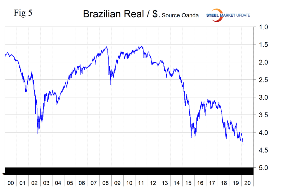 In the last 12 months, Brazil’s real has declined by 14.3 percent, by 3.9 percent in three months, and by 4.8 percent in the last 30 days (these values are not concurrent). Since Jan. 1, 2019, the real is down by 13.0 percent (Figure 5).