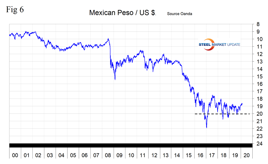 Mexico’s peso was unusually stable for the first seven months of 2019 before declining through 20 to the dollar on Aug. 28. By Feb. 14, 2020, the peso had recovered to 18.64 to the dollar. The peso has appreciated by 4.0 percent in the last three months and by 0.8 percent in the last 30 days (Figure 6).