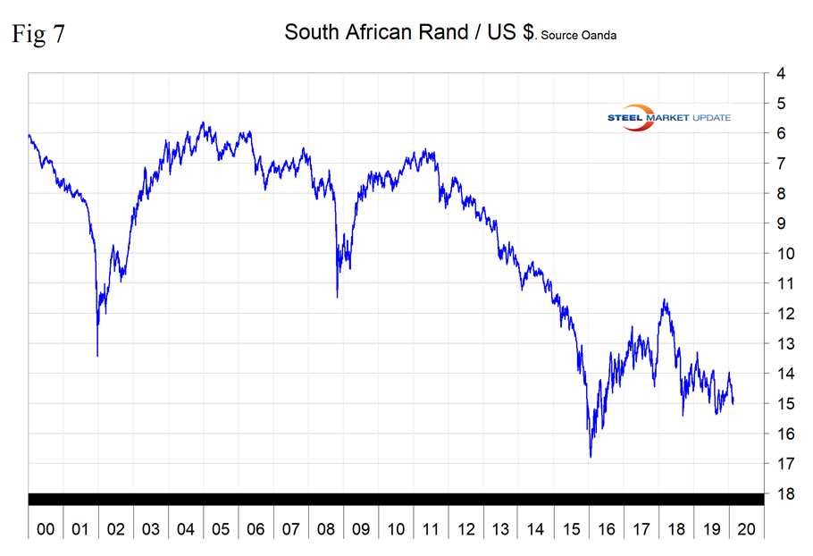 The South African rand has declined by 6.9 percent in the last year and by 3.3 percent in the last month (Figure 7).