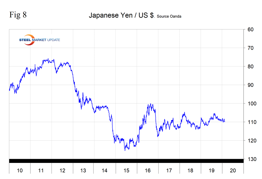 Japan’s yen has been virtually unchanged in the last 30 days and was down by 0.8 percent in the last three months. The Japanese currency has been rangebound for almost three years with a low of 115.2 on March 10, 2017, to a high of 105.94 on March 16, 2018. On Feb. 14, 2020, the U.S. dollar was worth 109.8 yen. On Feb. 8, the IMF published its Article IV Consultation with Japan. In summary, the Japanese economy is growing above its estimated potential, despite a significantly weaker external environment. Private consumption and public spending supported growth in the first three quarters of 2019, while exports and export-driven investment have softened in line with weaker external conditions. The two-percentage-point increase in the consumption tax rate in October 2019 appears to have had less impact than the last rate increase in 2014, due in part to government countermeasures. Real GDP growth is estimated to be above potential in 2019 at 1.0 percent. While the output gap is narrowing and labor markets remain tight, overall wage growth and inflation expectations remain stagnant. CPI headline inflation and the BOJ’s core-core inflation (excluding fresh food and energy) have risen in recent months but remain below the Bank of Japan’s 2 percent inflation target, the IMF said. Figure 8 shows the history of the yen value since 2010.