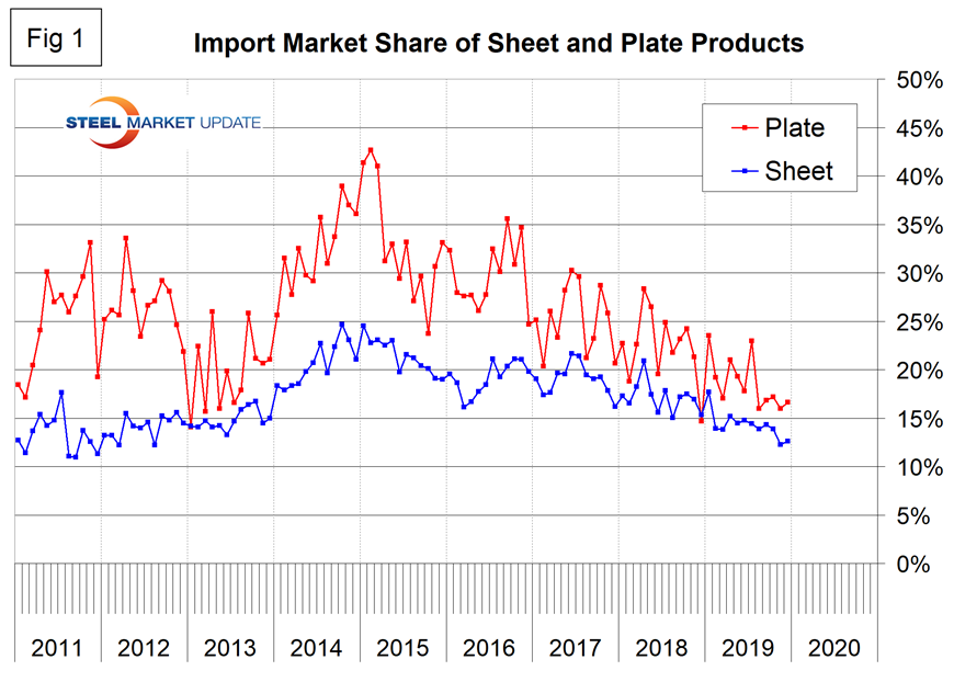 Figure 1 shows the historical import market share of plate and total sheet products. The import share of plate has been decreasing erratically since February 2015. There has been a downward drift of sheet product import share for almost three years.