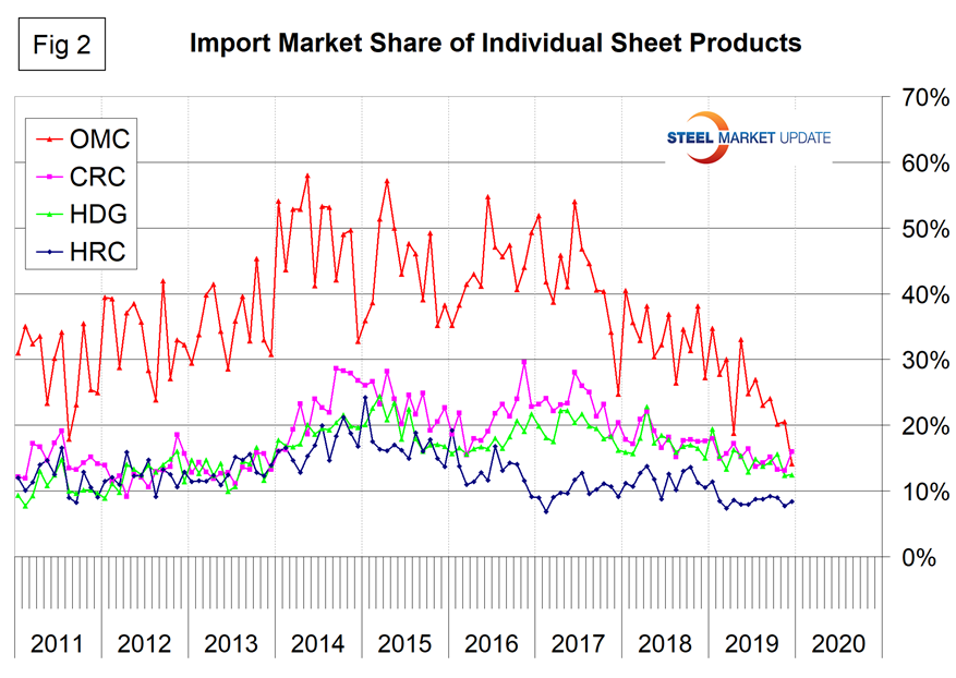 Since January 2019, the import market share of total sheet products has been below 15 percent with an 11-month average of 14.0 percent. The import share of HRC has been below 10 percent since January 2019. The most striking result in this analysis is the data for other metallic coated sheet, which shows the import share has declined by more than half in two years, not just because imports were down but also because domestic shipments have increased by almost 50 percent since mid-2017.