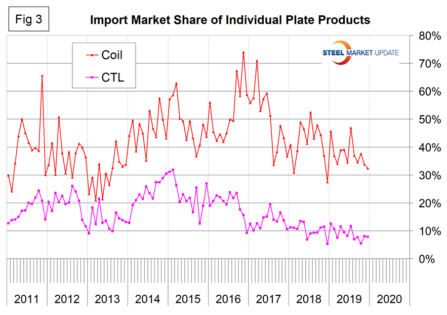 Figure 3 breaks out coiled and discrete plate from the flat rolled total and shows that in Q4 2019, coil imports had almost five times the market share as CTL imports.