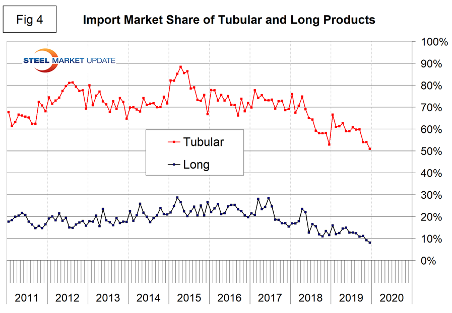 Figure 4 describes the total import share of tubular goods and long products. It is evident as we work the numbers that data for the domestic production of tubulars is greatly understated. This is probably because of a more fragmented supply chain and the independent tubers not reporting to the extent that the steel mills do for other products. This has the result of increasing the apparent import market share. Even though we don’t believe these numbers for tubulars, we are including them here in the belief that trends should still have some validity. Since May 2018 the import market share of long products has been historically low.