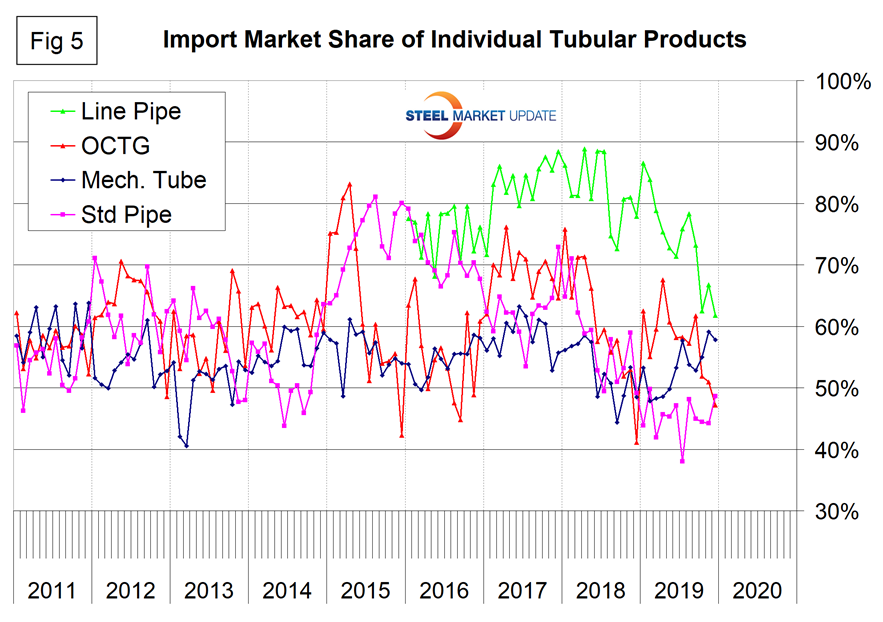 Figure 5 shows the import market share of the individual tubular products. Based on the available information, all are very high compared to other steel product groups. Line pipe is the highest, but declined dramatically in 2019. We hope that the errors in the tubular data are consistent and the shape of the curves in Figure 5 is useful to industry professionals.