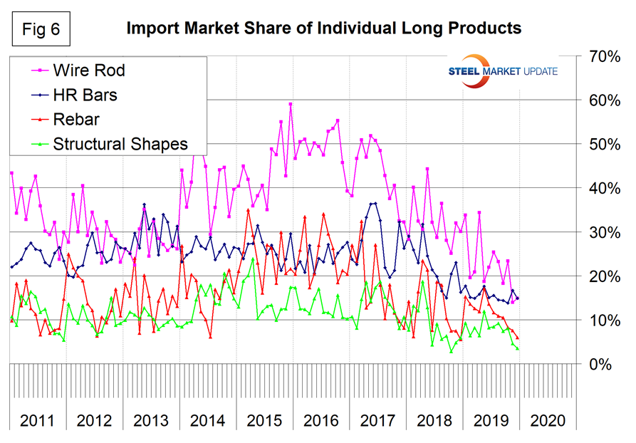 Figure 6 shows the detail for the four major sectors of the long product group. The most significant reduction is for wire rod, which in the years 2014 through most of 2017 had double the import market share of the other long products. In the second half of 2017, the gap began to narrow to the point that in November 2019 the import share of wire rod fell below that of hot rolled bars. Rebar has been very erratic, but the import share fell to a historically low level in December 2019. After increasing for six months in 2018, the import market share of structural shapes has been declining for the last six months.