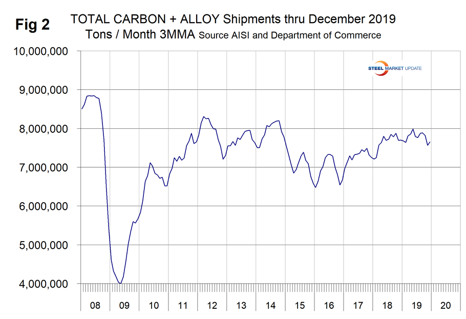 SMU Comment: Weekly data from the AISI shows steel production to be increasing by 1.6 percent year over year in the latest results for the week ending Feb. 8. This positive growth trend began in the week ending Jan. 4, 2020. The main thrust of the report you are reading now is monthly data ending in December 2019.