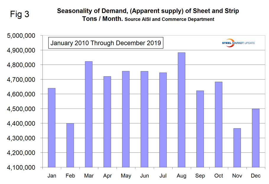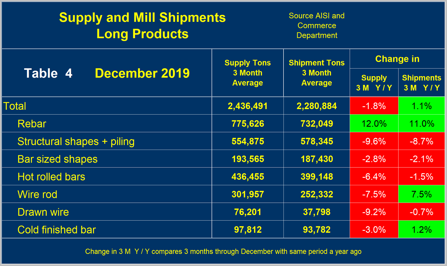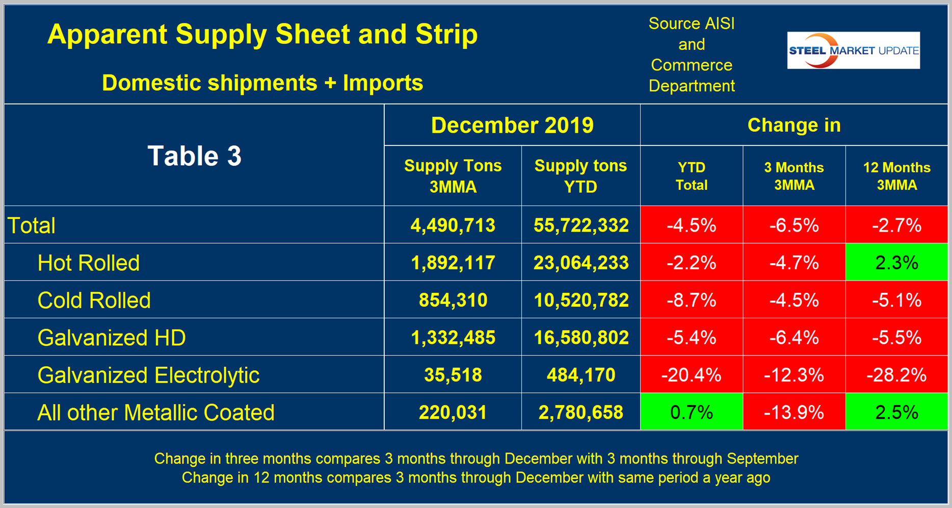Table 2 describes both apparent supply and mill shipments of sheet products (shipments includes exports) side by side as three-month averages through December with year-over-year growth rates for each. Comparing the year-over-year time periods, total supply of sheet products to the market decreased by 2.7 percent on a 3MMA basis and mill shipments increased by 1.7 percent. Table 2 breaks down the total into product detail and shows that both shipments and supply were up for hot rolled and other metallic coated, which is mainly Galvalume, and down for cold rolled and galvanized products. Apparent supply is defined as domestic mill shipments to domestic locations plus imports. In the three months through December 2019, the average monthly supply of sheet and strip was 4.491 million tons. There is no seasonal manipulation of any of these numbers. By definition, year-over-year comparisons have seasonality removed.