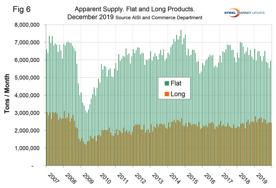 The shipments and supply report that you are reading now is based on monthly shipments by product as reported by the AISI plus import and export data from the DOC. Figure 2 shows the monthly shipment data for all rolled steel products. In the long run the trajectories of growth in Figures 1 and 2 are comparable, but the decline in 2019 is less obvious in the monthly data.