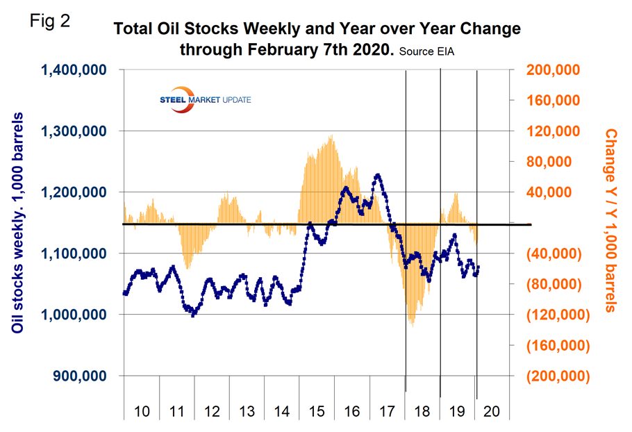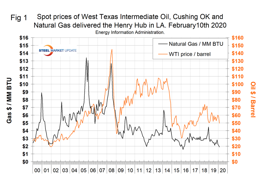 Figure 1 shows historical oil and gas prices on a mid-month basis from January 2000 through Feb. 10, 2020. On that date, WTI was priced at $49.59 and Brent at $53.39 per barrel (see note at the end of this piece). Our price and inventory data come from the EIA (Energy Information Administration). On Feb 7, natural gas at the Henry Hub in Oklahoma was priced at $1.89 per MMBTU (million British Thermal Units.), down from $2.81 on Nov. 8. Natural gas is priced to continue making inroads against coal as an electric power generator, which is the primary consumer of natural gas in the United States.