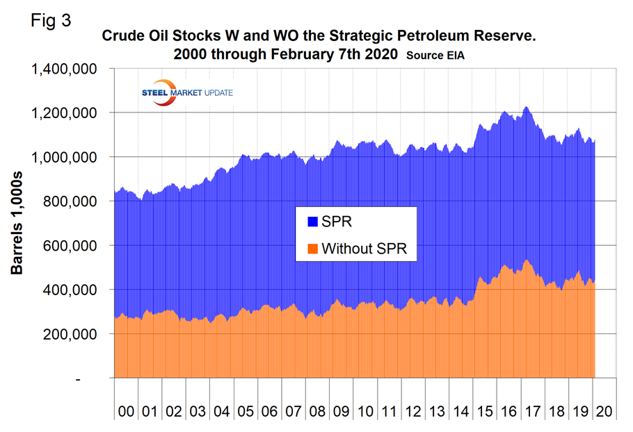 On Feb. 7, the EIA reported that U.S. commercial crude oil inventories (excluding those in the SPR (Strategic Petroleum Reserve) decreased by 4.8 million barrels since the end of November, which is insignificant as a proportion of the more than one billion barrels available. Including the SPR, total inventory on Feb. 7 was 1.08 billion barrels. Figure 2 shows the inventory level, including the SPR and the year-over-year change. Figure 3 breaks total crude inventory into the working portion and the strategic reserve.