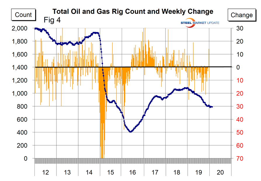 The total number of operating rigs in the U.S. on Feb. 14 was 790, which was unchanged for three weeks but down from 1,083 in the last week of 2018. Oil rigs were down by 207 and gas by 88. Figure 4 shows the total number of operating rigs in the U.S. and the weekly change.