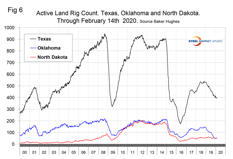 On a regional basis in the U.S., the big three states for operating rigs are Texas, Oklahoma and North Dakota. Figure 6 shows the land rig count in those states since 2000.