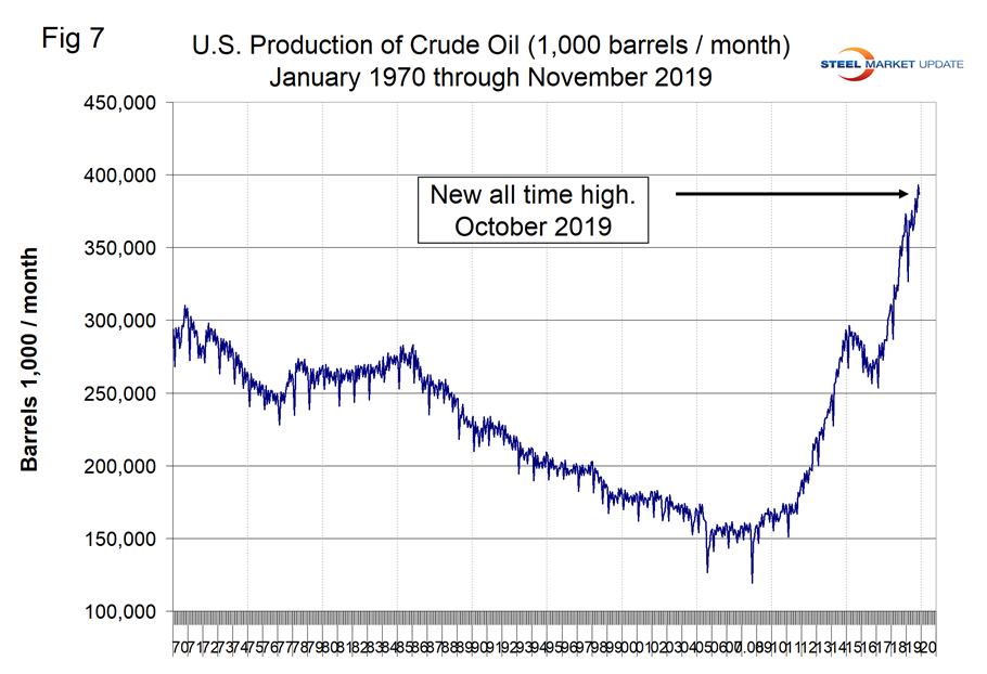 Figure 7 illustrates the monthly U.S. oilfield production of crude from January 1970 through November 2019 (latest data available) in thousands of barrels per month. The historical high was October 1970 at 310.4 million barrels. Production steadily declined to half that level in the late 2000s before the fracking revolution. December 2017 broke the record that had stood for 47 years with 311.2 million barrels produced. October 2019 set another record of 392.3 million barrels, up from 374.5 in September.