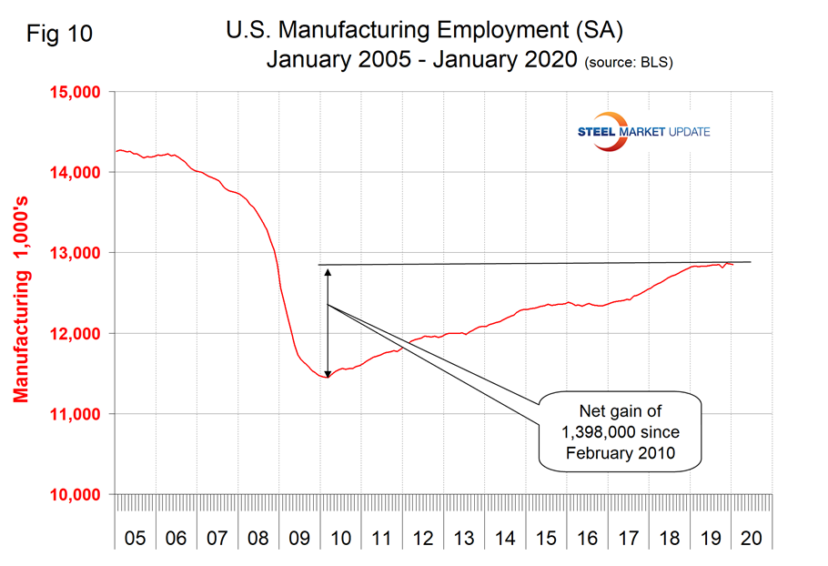 Manufacturing employment plummeted during the recession and gradually improved from the spring of 2010 through 2014. Growth was flat in 2015 and declined slightly in 2016 when 23,000 jobs were lost during the year as a whole. There was a turnaround in 2017, and 264,000 jobs were created in the 12 months of 2018. The number of manufacturing jobs created in 2019 was 58,000 and in January 2020, 12,000 jobs were lost (Figure 10).