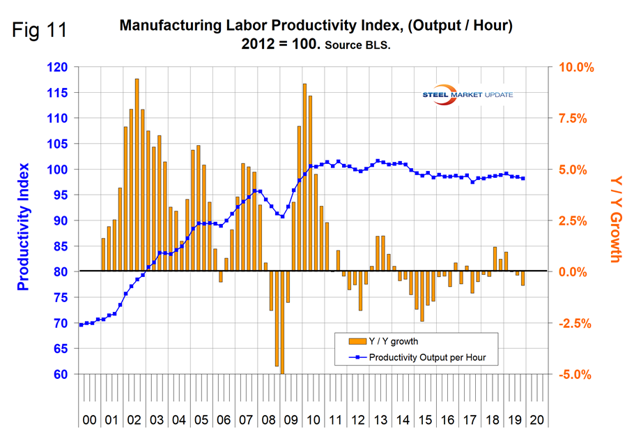 The Bureau of Labor Statistics reported that in Q4 2019 manufacturing productivity declined by 0.7 percent, down from an average of positive 0.74 percent in the four quarters of 2018 (Figure 11). Productivity is lower than it was in 2013 and has been treading water for the last five years.