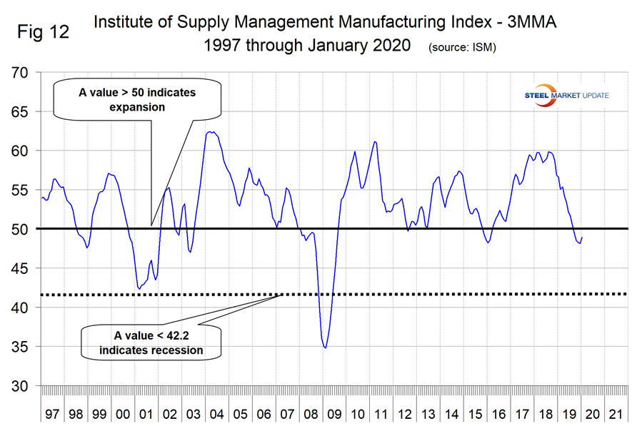 The Institute for Supply Management’s Manufacturing Index is a diffusion index. ISM states: “Diffusion indexes have the properties of leading indicators and are convenient summary measures showing the prevailing direction of change and the scope of change. An index value above 50 indicates that the manufacturing economy is generally expanding; below 50 indicates the opposite.” Figure 12 shows the 3MMA of the ISM index from January 1997 through January 2020. The index surged from February 2016 through October 2017, leveled off through October 2018 and has declined through December 2019. There was a welcome surge in January 2020 when the index rose to 50.9 from 47.8 on December. The 3MMA was down by 7.7 points year over year, which was a slight improvement from October when it was down by 11.03 points. September 2019 was the first month for the 3MMA of the index to be below 50 since March 2016. On Feb. 20, Michael Gayed of the Lead Lag report wrote: “On Feb. 3, we finally received some welcome news from the manufacturing sector, when the Institute for Supply Management (ISM) released its January Manufacturing Report for the U.S. saying that the number bounced would be an understatement. Manufacturing rebounded to a 50.9, now into expansionary territory. As I noted on the Lead-Lag report last week, this was one of the few recessionary signals that has now reversed into expansionary, much like the yield curve inversion did in 2019. The 3.7 increase off December’s small number was one of the most substantial bounces in the last 20 years and was the largest bounce since May 2009. Expectations for this month’s report were for a 48.5 reading, so to see the number come well above into expansionary growth was excellent. Remember, we just had a five-month stretch from July to December with contractionary readings, so economists in the U.S. are breathing a sigh of relief. If we can sustain growth in the manufacturing sector to complement the already steady and robust consumer sector, not much could stop this U.S. expansion anytime soon. Especially if the Federal Reserve stays at our back and follows through without any interest hikes in 2020 (they have maintained a preference to keep rates steady, and I think they are leaning towards another insurance rate cut, if anything).”