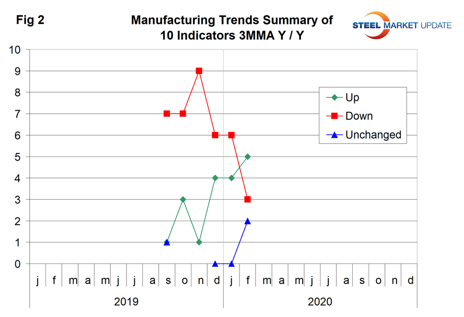 This report summarizes 10 data streams that describe the state of U.S. manufacturing in general and the steel industry in particular. We have reported on most of these separately in our Steel Market Update publications, and therefore will be brief in this summary. Our intent in summarizing them in one document is to provide a consensus of the state of this critical steel consuming sector. In data released in February, the year-over-year growth rate of nine of the 10 data streams was negative on a 3MMA (three-month moving average) basis and one was positive. Figure 1 is a summary of data received in February and shows the year-over-year percentage change on a 3MMA basis. The summary sheet shows directional arrows comparing February data releases to January’s. Based on American Iron and Steel Institute estimates of steel mill shipments by market classification, almost 50 percent of the steel consumed in the U.S. is manufacturing-oriented. This breaks down to about 27 percent in ground transportation, 9 percent in machinery and equipment, 5 percent in appliances, 4 percent in defense and about 4 percent in containers.