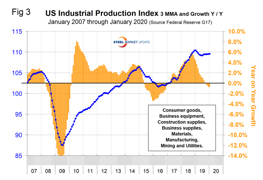 Figure 3 shows the 3MMA of the industrial production (IP) index since January 2007 as the blue line and the year-over-year growth as the brown bars. The IP index is a gauge of output from factories, mines and utilities. Year-over-year the growth of the 3MMA peaked at 5.8 percent in September 2018 and contracted every month through December when it reached negative 0.7 percent. January was unchanged, also at negative 0.7 percent. Manufacturing capacity utilization improved from 74.48 percent in February 2017 to 77.01 percent in December 2018 and had declined in 2019 to 75.02 percent in December with a negative year-over-year growth rate of 2.6 percent on a 3MMA basis. In January the growth rate improved to negative 2.3 percent and a value of 75.18 (Figure 4).