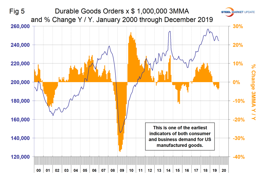The year-over-year growth rate of durable goods reached 10.1 percent in September 2018 and then had declined to negative 4.0 percent in November 2019. There was an improvement to negative 3.2 percent in December. Figure 4 shows the 3MMA since January 2010. This is considered to be one of the earliest indicators of both consumer and business demand for U.S. manufactured goods. Orders picked up in June through August last year, but year over year are still in negative territory.