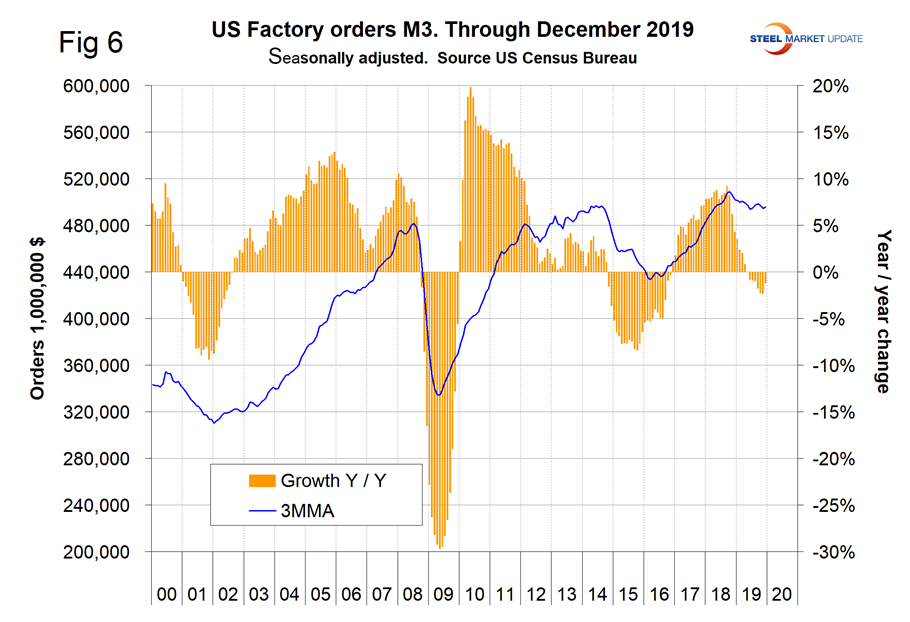The growth rate of new orders for manufactured products as reported by the Census Bureau declined for 14 straight months on a 3MMA basis from 9.2 percent in September 2018 to negative 2.3 percent in November 2019. There was an improvement to negative 1.2 percent in December, which yielded a green arrow in Figure 1 (Figure 6).