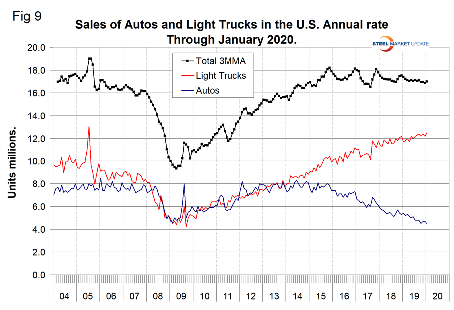 Year over year on a 3MMA basis, light vehicle sales were down by 2.3 percent in January, which was an improvement from the 3.8 percent decline in December. In January, sales were 17.0 million units annualized and were comprised of 73.5 percent light trucks and 26.5 percent autos. This was the highest proportion of light trucks, which includes crossovers and SUVs, ever. Light vehicle sales have trended down slightly in the last three years as measured by the cyclical peaks. Overall, sales are still higher than the pre-recession level of 2007 (Figure 9). Import market share in December was 21.8 percent, which was at the bottom of the range for the last two years.