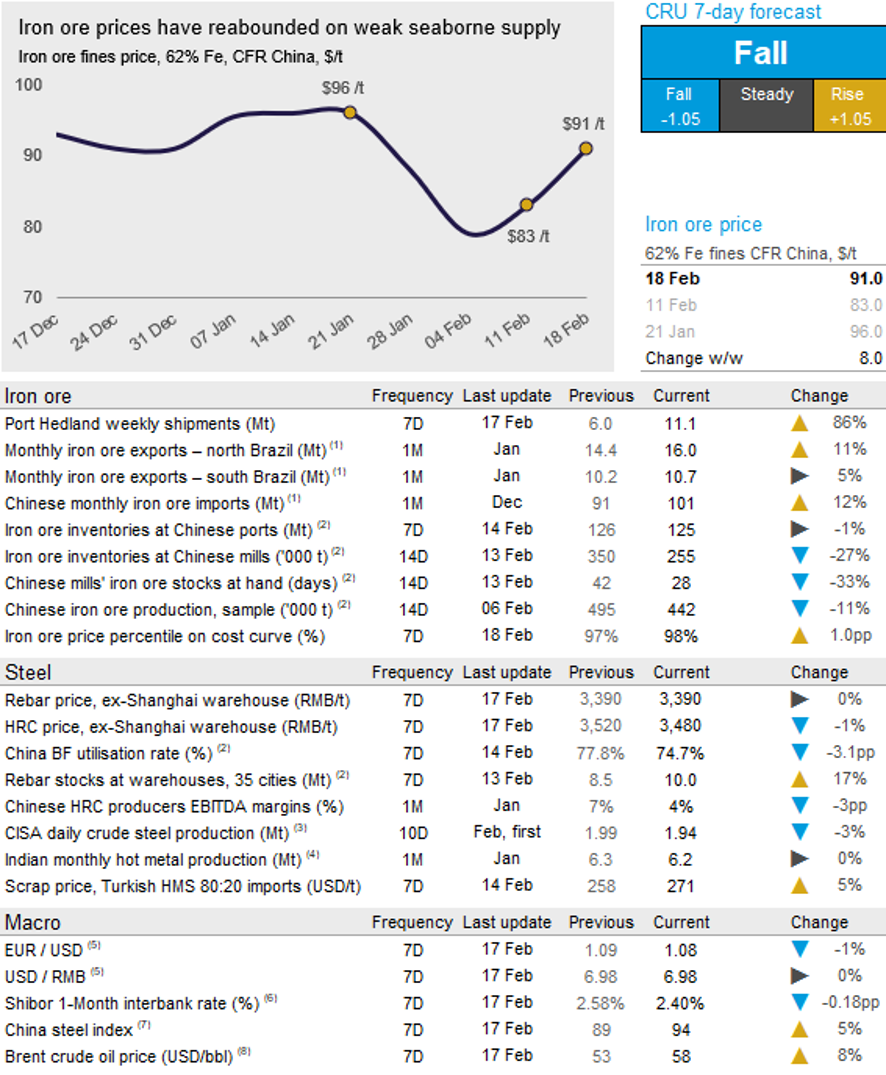 Iron ore prices rebounded in the past week as arrivals of seaborne iron ore to China were at their weakest level in over six months. Port stocks in China fell w/w and talks about further stimulus and a drop in the number of new Covid-19 infections brought the bullish sentiment back to the iron ore market. On Tuesday, Feb. 18, CRU has assessed the 62% Fe fines price at $91.0 /dmt, up by $8.0 /dmt w/w.