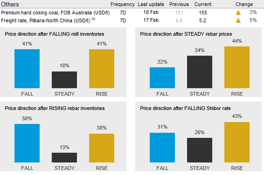 On the seaborne market, shipments from Port Hedland have improved significantly after Cyclone Damien forced the port to shut for nearly three days between Feb. 7-10, which we estimate to result in 3-4 Mt of lost supply. In the past week, we saw exports of 11.1 Mt, one of the highest figures observed in the past 12 months. Rio Tinto was hit much harder by the cyclone. Its two ports, Dampier and Cape Lambert, stopped exporting for six days and the company lost ~6 Mt of iron ore supply. Shipments from Brazil have improved somewhat in the past week, but weather conditions in Minas Gerais are still poor and exports are far away from normal levels. In addition, Vale has reduced its Q1 production figure after announcing its Brucutu mine will be operating at reduced levels until end-March.