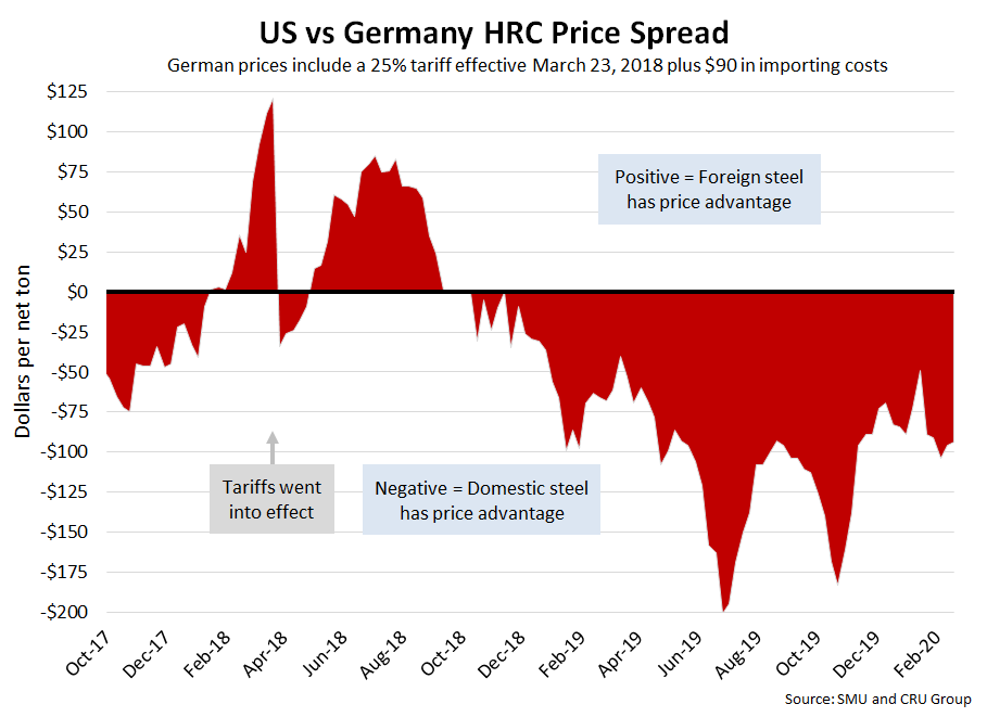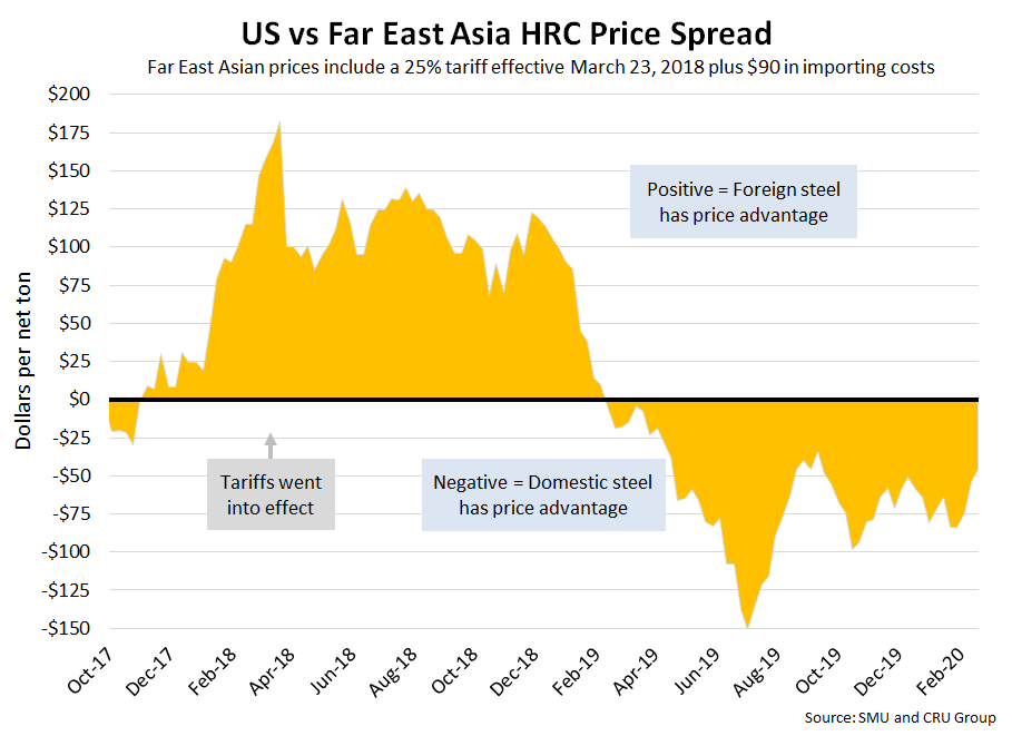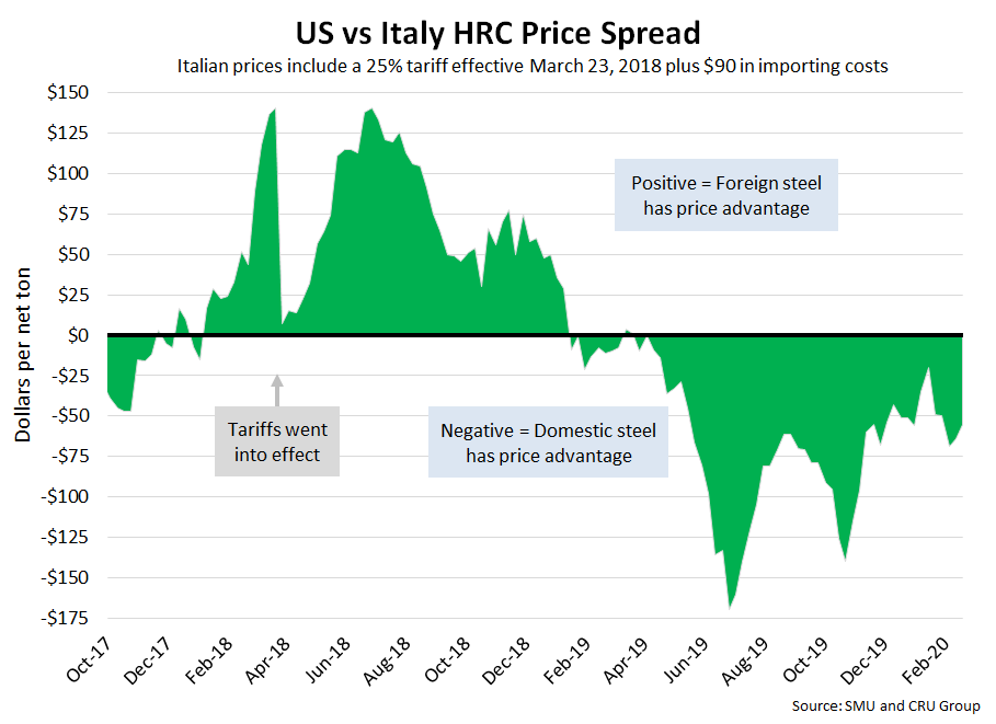 SMU includes a 25 percent import tariff effective on foreign prices after March 23, 2018. We then add $90 per ton to the foreign prices in consideration of freight costs, handling, trader margin, etc., to provide an approximate “CIF U.S. ports price” that can be compared against the SMU U.S. hot rolled price. Note that we do not include any antidumping (AD) or countervailing duties (CVD) in this analysis.