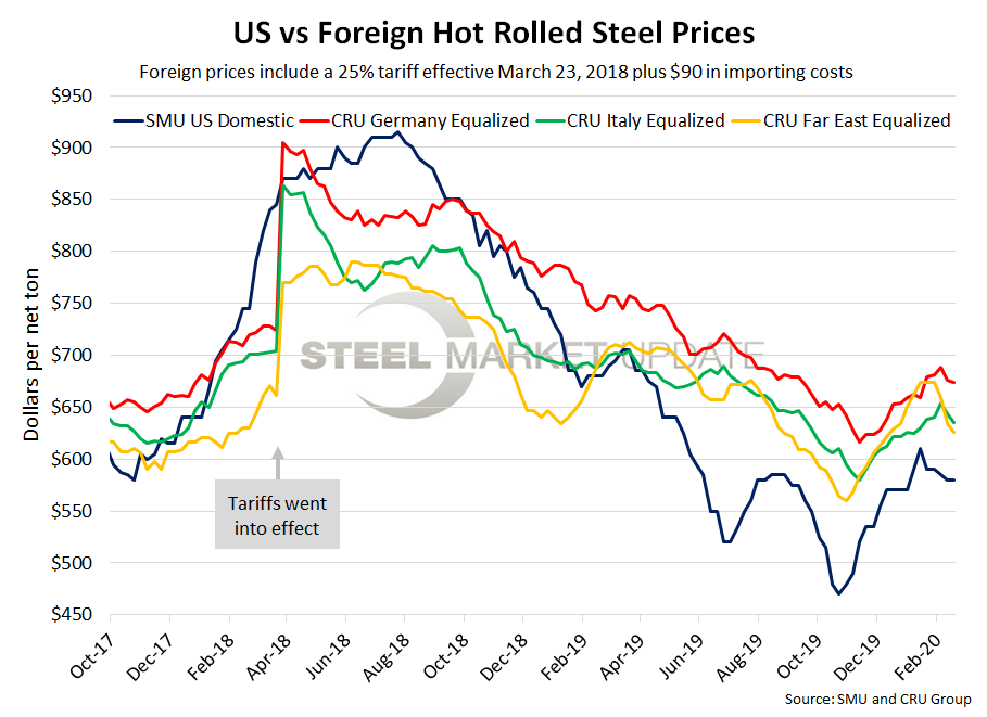 The CRU Far East Asian HRC price fell $6 over last week to $429 per net ton, down $26 from two weeks prior. Adding tariffs and import costs, the delivered price of Far East Asian HRC to the U.S. is $626 per ton. Therefore, U.S.-produced HRC is theoretically $46 per ton cheaper than imported Far East Asian HRC; the spread was $54 last week and $74 two weeks ago. Domestic prices have held this price advantage for 54 consecutive weeks.