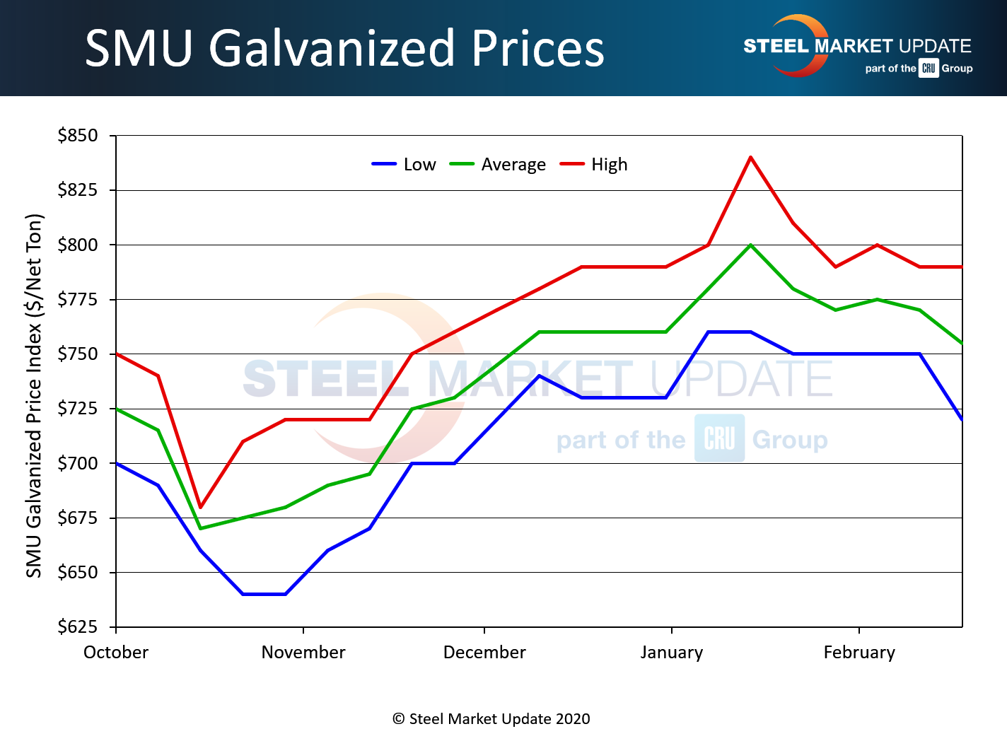 When markets start to change, we get a widening of the spread. The spread widens because not every spot buyer is in the market at all times, different mills react to weakness (or strength) in their order books differently and for many other reasons. Based on the SMU galvanized index, the market peaked the week of Jan. 14 (which is a Tuesday, the day we publish our pricing) at an $800 per ton average and a range of $760 to $840.