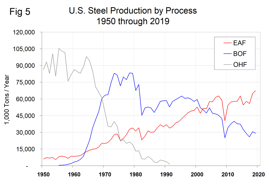 In 2019, the growth of the EAF sector continued at the expense of the integrated mills. Figure 5 shows the history of U.S. steel production by process since 1950. In 1969 the BOF overtook the open heath furnace as the primary producer and 34 years later in 2003, the BOF lost that status to the EAF. In 2009, 69.8 percent of U.S production was by the EAF, up from 68.0 percent in 2018. This trend is expected to continue for the foreseeable future and in addition to natural market trends will be accelerated by climate change considerations.