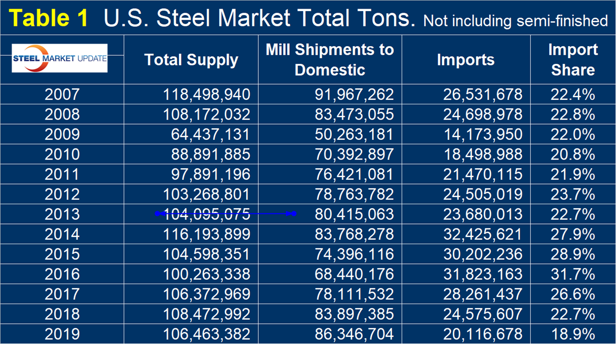 Table 1 shows 13 years of history of total steel supply to the U.S. market in short tons broken down into shipments from domestic mills and imports, excluding semi-finished. The hot rolled steel market totaled 106.5 million tons in 2019. Supply declined in the steel recession of 2015 and 2016, increased in 2017 and 2018, and declined by 1.9 percent in 2019. In 2019, imports excluding semis totaled 20.1 million short tons, down from 28.3 million in 2017 and 24.6 million in 2018.