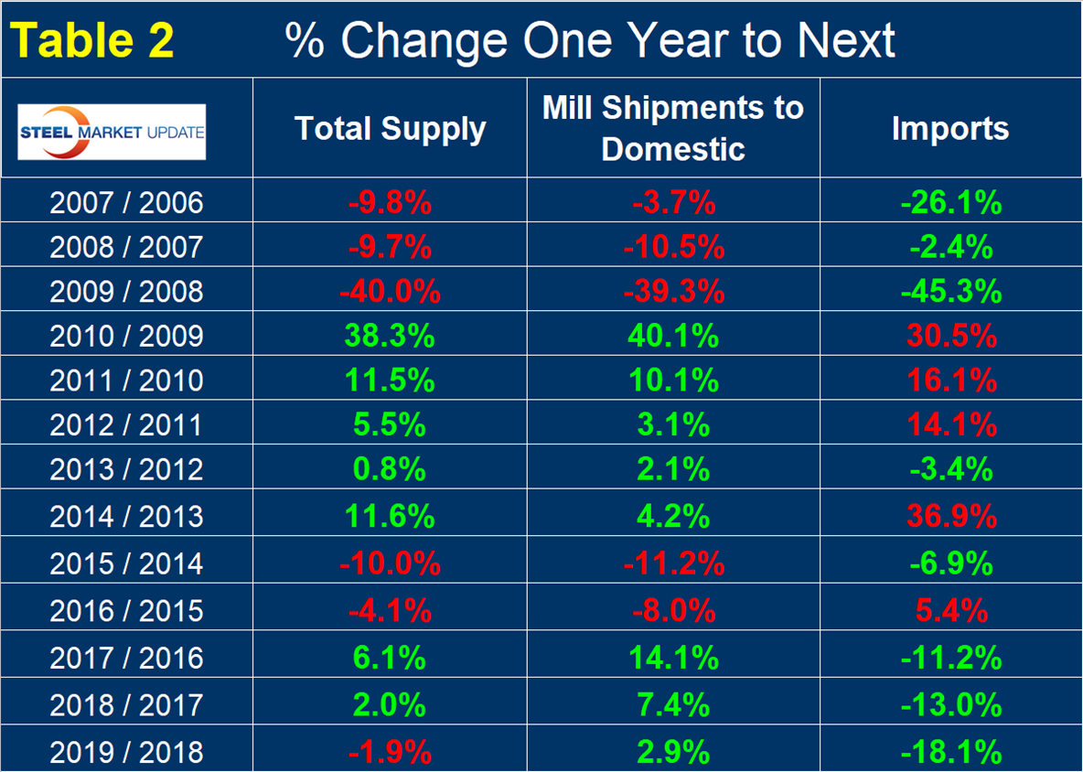 Table 2 shows the year-over-year change annually since 2006. In 2019, the total market was down 1.9 percent, but the domestic mills took share from imports. Compared to 2018, mill shipments to domestic locations were up by 2.9 percent, while imports were down by 18.1 percent.